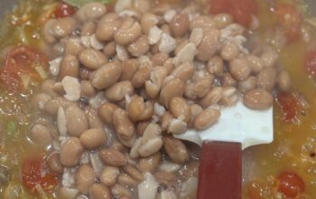 Tip in the beans with their liquid and pour in the chicken stock. Bring to the boil, then reduce to a simmer.