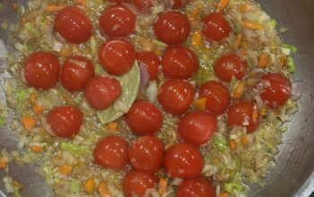 Stir in the tomato purée and cook for a couple of minutes. We found some fresh tomatoes laying around, so added them in as well.