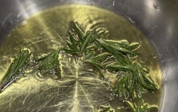 Heat the olive oil in a pan over medium heat. Add the herbs and fry for 1–2 minutes to release their aroma, then remove them.