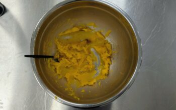When the pumpkin is cool enough to handle, scoop out the flesh into a bowl. Add in the oil and mix with a heavy spoon until smooth.