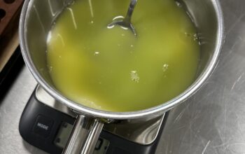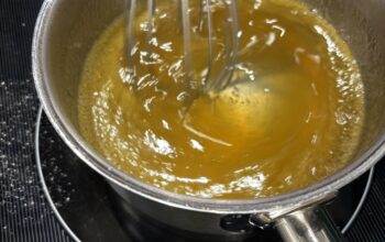 Add your strained juice to a pot and stir in 225g of sugar and the glucose. Slowly bring the mixture to a boil, stirring constantly. Doing this slowly and constantly stirring will prevent the final mixture from tasting grainy. Take your time here.