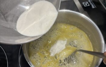 Mix the rest of the sugar with the pectine and add it gradually to the boiling mix. Again, take your time here and stir constantly to prevent lumps.